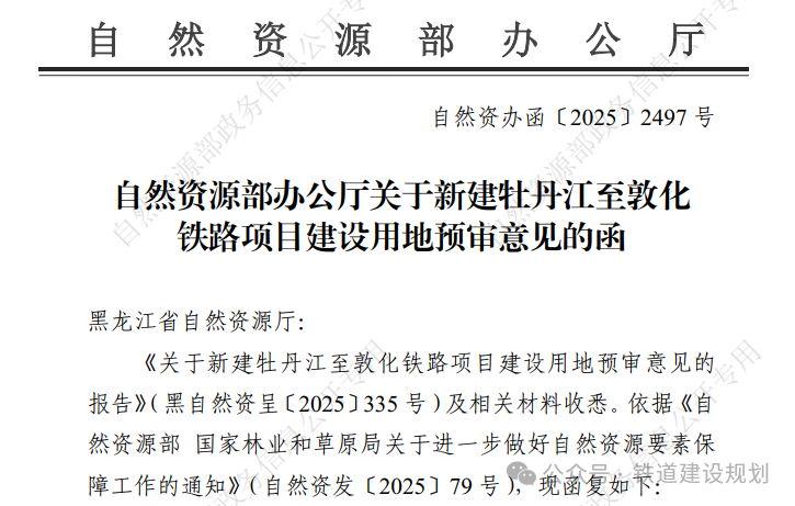 2025/11/0310月30日,自然資源部辦公廳印發《關于新建牡丹江至敦化鐵路項目建設用地預審意見的函》,牡敦高鐵黑龍江段用地預審正式獲國家批復,為項目可研批復奠定了基礎。根據意見函:“新建牡丹至敦化鐵路項目(項目代碼:24...