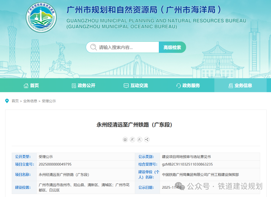 2025/11/17近日,廣州市規劃和自然資源局正式受理了永州經清遠至廣州鐵路項目(廣東段)用地預審與選址意見書。項目用地預審與選址進入審批階段,將力爭在年底前批復可研。根據項目可研方案:永州經清遠至廣州鐵路自在建邵永鐵...